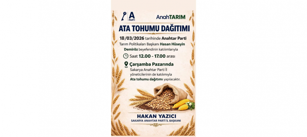 Anahtar Parti Sakarya İl Başkanı Hakan Yazıcı, tarımda yerli üretimin güçlendirilmesi amacıyla önemli bir etkinliğe imza atacaklarını açıkladı. 18 Mart 2026 tarihinde, Anahtar Parti Tarım Politikaları Başkanı Hasan Hüseyin Demiröz’ün katılımıyla Sakarya’da ata tohumu dağıtımı gerçekleştirileceğini belirtti.